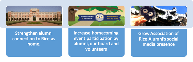 I was tasked with creating a social media campaign strategy that suited the event theme while meeting three primary goals: strengthening the alumni connection to Rice as home, increasing event participation and growing the Rice Alumni presence on social media.